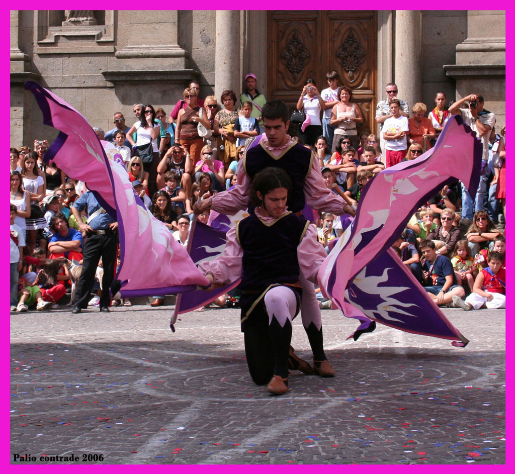 Sembrava una farfalla gigante. E' vero che gli sbandieratori sono in ombra, ma sarà sempre meglio questa inquadratura rispetto a quella scattata di spalle da parte di uno del pubblico.(estrema destra)