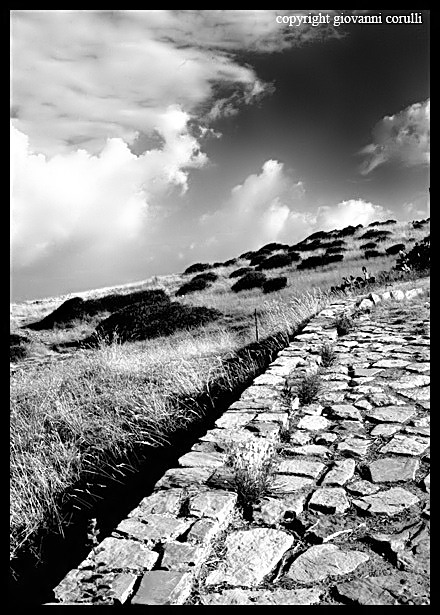 Il B/N è un pò troppo contrastato, il cielo va bene ma il terreno ha ombre troppo dense e alte luci bruciate. Compositivamente non comprendo la scelta del formato verticale con la linea della strada che "sbatte" contro la parete interropendo bruscamente il percorso visivo.