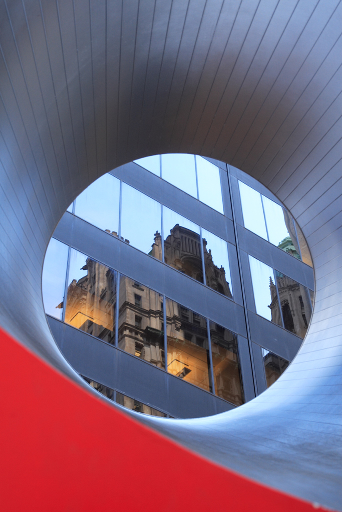Mi è sembrata una buona composizione, la foto è stata scattata attraverso la scultura a forma di cubo, non ricordo il nome, che si trova a New York.