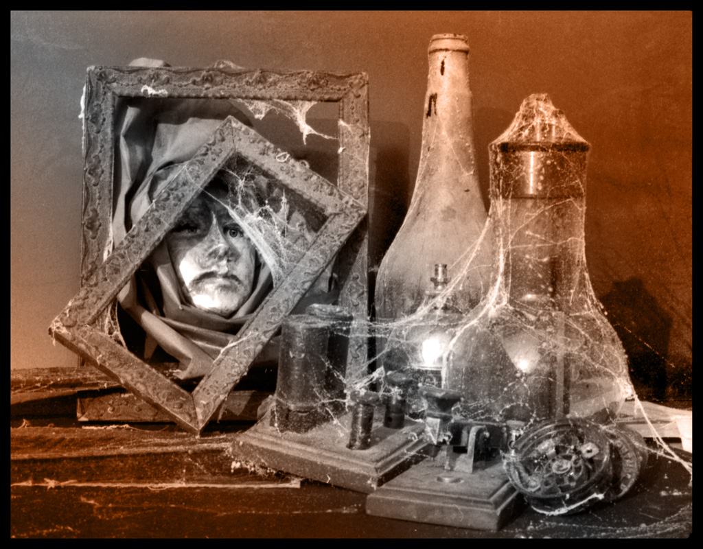 Ho utilizzato vecchie cornici, ampolle, un vecchio telegrafo, vecchi attrezzi (trovati ad un mercatino di roba usata) di un passato ormai lontano; una bomboletta per effetti speciali (ragnatele nella fattispecie..da come si evince chiaramente) qualche prova di composizione...il risultato è tutta una serie di scatti. Questo per la preparazione scenografica.