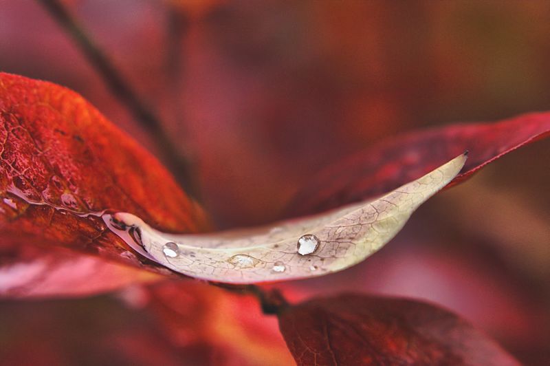 Splendida armonia di colori delicatissimi... e quella foglia che non si capisce bene se sia un sorriso o una piccola culla che accompagna dolcemente il riposo delle sue goccioline.
