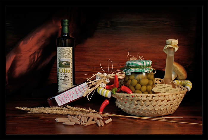 Innanzitutto mi sembra leggermente storta (vedi bottiglia d'olio) ed inoltre la composizione mi sembra sbilanciata a destra: il cesto che occupa più volume sta più vicino al bordo di quanto non lo sia l'olio. Allargando la scena a destra avresti forse incluso tutto lo stelo del frumento che mozzato non mi piace.
