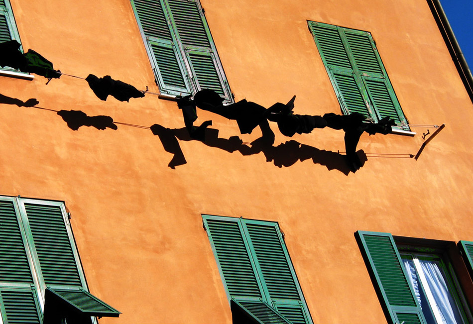 tutta la biancheria nera in contrasto all'arancio della facciata...