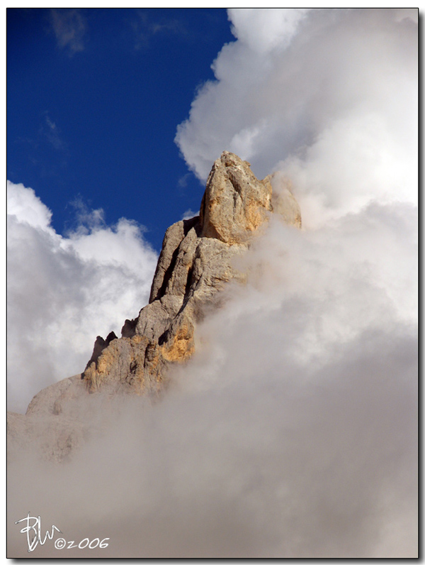 Questa cima che sorge dalle nubi è molto bella, un pò di nitidezza in più non avrebbe guastato comunque. Sembra la parte sommitale del Cimon della Pala. Dove l'hai scattata? Ciao  |