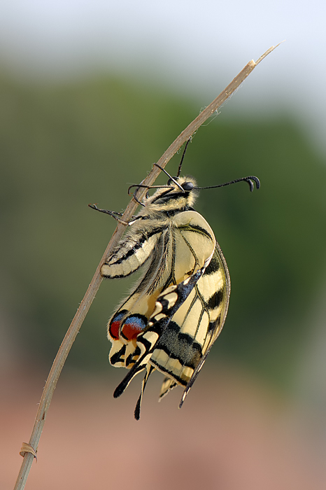 La fortuna ha voluto che dopo 35 anni di foto mi imbattessi casualmente in una nascita, ho visto muoversi una cosa flaccida e ho curiosato, con mia grande sorpresa era un macaone appena nato, ho preso uno stecco e l'ho fatto aggrappare e da quel momento mi sono sostituito al sole, circa 200 scatti.