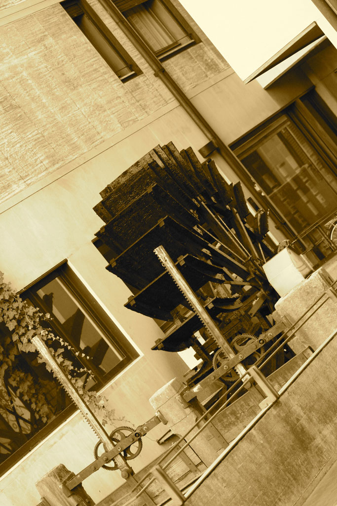 poi avrei messo in risalto gli ingranaggi in primo piano quindi tagliando il palazzo di sfondo