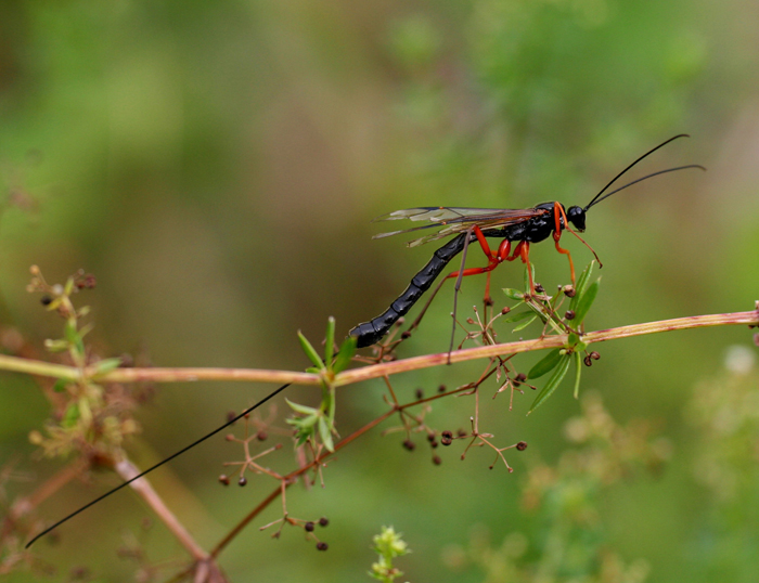 Quasi: è un parente stretto della Rhyssa persuasoria (che ha dei disegni gialli sul corpo e le zampe un po' più sull'arancione), si chiama Ephialtes manifestator; la femmina (questa) percepisce con le antenne la presenza di una larva di un coleottero Cerambycidae all'interno di un tronco: allora curva l'addome, fa uscire dal fodero a due valve (quella "coda" lunga che si vede nella foto) il lungo ovopositore e comincia a infilarlo lentamente nel legno fino a raggiungere la larva del coleottero (come si può vedere qui http://www.natur-lexikon.com/Texte/MZ/002/00135-Holzschlupfwespe/mz00135-Holzschlupfwespe.html ); quando l'ha raggiunto, fa discendere un uovo attraverso il canale dell'ovopositore e lo depone all'interno della malcapitata larva. La larva dell'Ephialtes si ciberà di quella cel cerambicide, mangiandolo letteralmente vivo... _________________ Paolo Mazzei