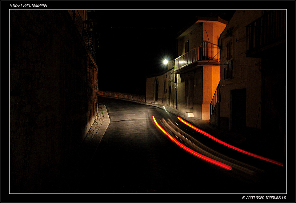 Soprattutto per il gioco di luci: il lampione, la luce calda del vicolo, i fari dell'auto che illuminano la strada e la strisciata dei fanalini posteriori. Ok!