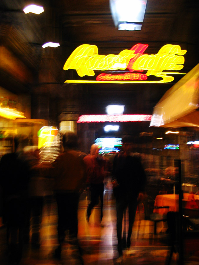 L'insegna in alto fa un certo effetto, e riesce a catturare l'attenzione. Lo scatto comunica quel che vuole essere, l'effetto di una camminata notturna.