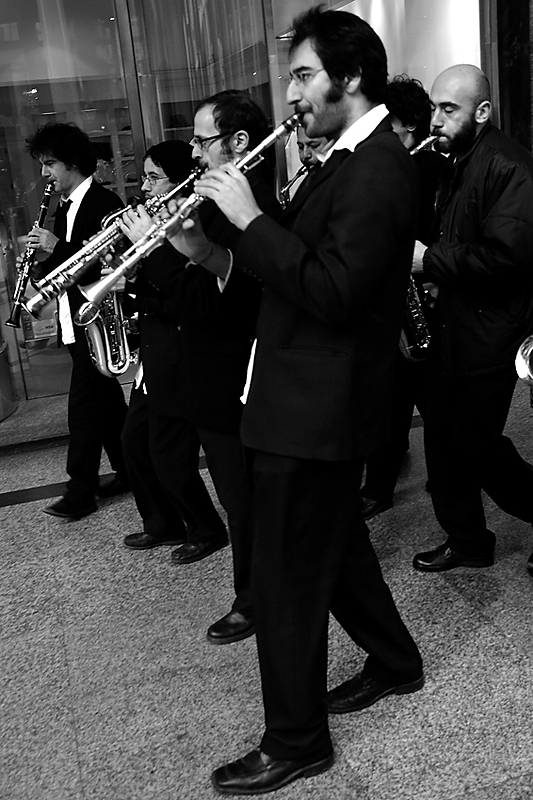 La pendenza è voluta (e questo può essere considerato da altri giusto o sbagliato) perché ho costruito l'inquadratura sulla verticale del suonatore di oboe in primo piano. Mi pareva desse maggior dinamismo.