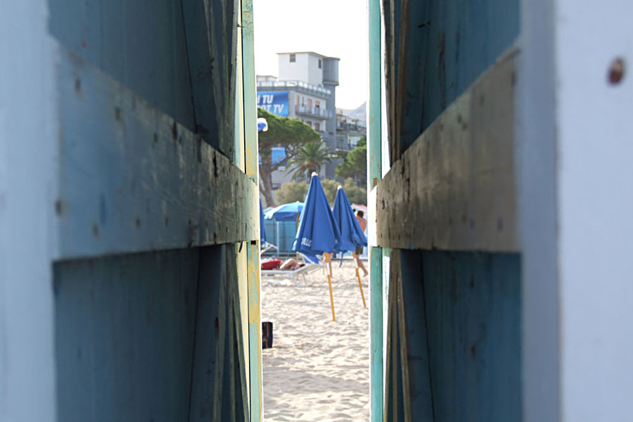 Mi piace la corrispondenza tra il blu delle cabine in primo piano e quello degli ombrelloni.