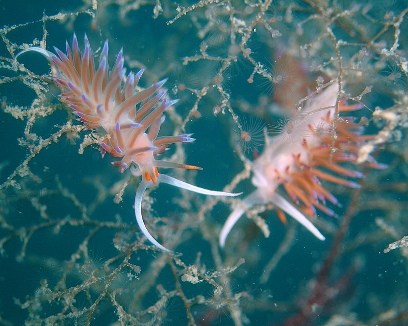 Per il riconoscimento: non è semplice dire con certezza di quale idroide si tratti. Dato per scontato questo, andiamo per esclusione. La C. peregrina si ciba di Aiptasia, e non è certo questo. Di vari tipi di Eudendrium spp. e Corydendrium spp., Pennaria cavolinii e Tubularia. Credo si tratti di una delle specie di Eudendrium, ma ci sono almeno dieci specie diverse nel Med, e non sono riconoscibili attraverso delle immagini. Si potrebbe supporre si tratti Eudendrium racemosum, è quella che assomiglia di più.