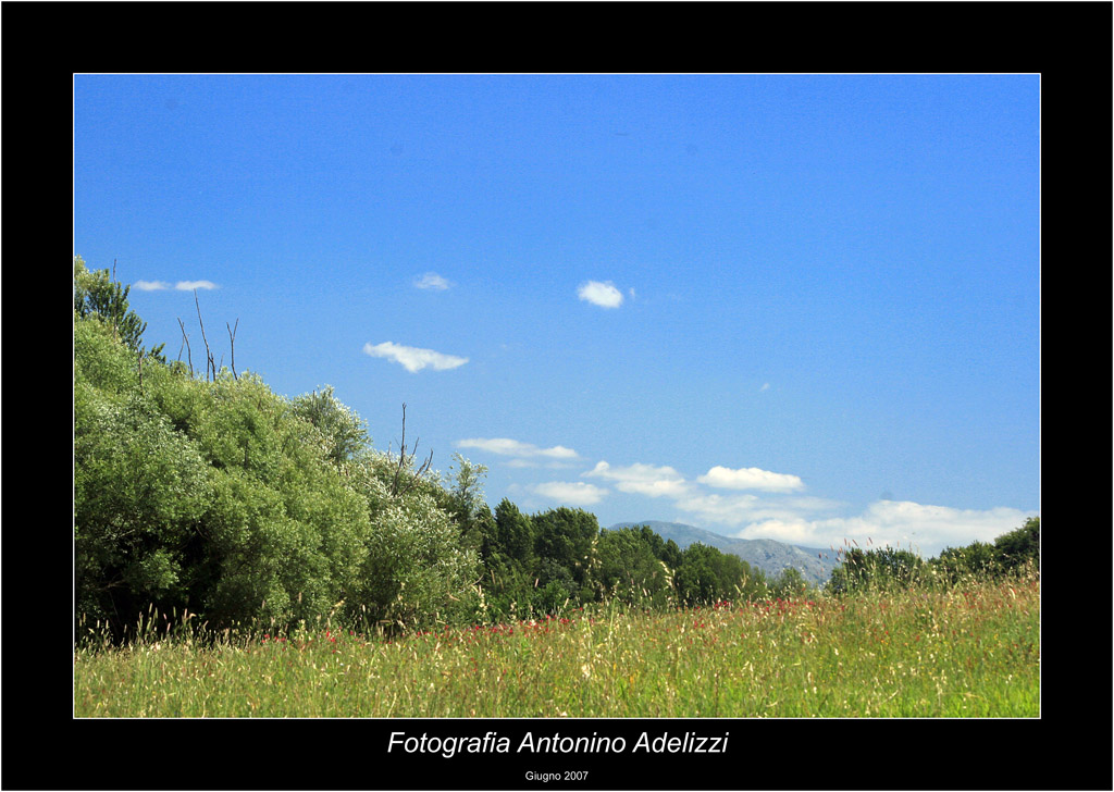 Il prato inclinato da un lato , la seconda linea di alberi dall'altro di un bel verde con il prato spruzzato dai colori del sole si stagliano sul cielo azzurro macchiato dalle nuvolette sparse....