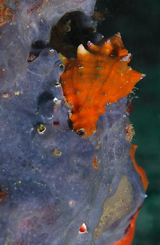 Questa è tutto sommato una foto da essere umano; il soggetto è di quelli che abbondano, anche se la spugna arancione che ricopre la conchiglia del murice la impreziosisce.