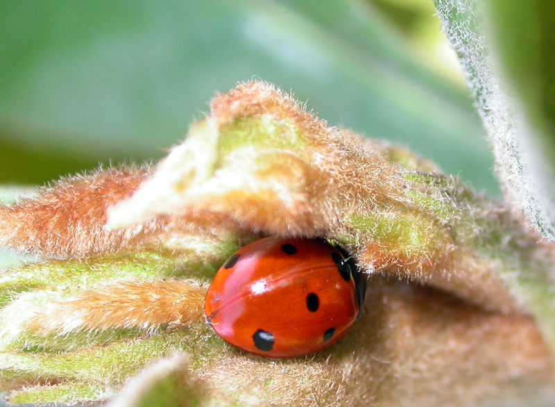 Bella la scena, mi piace molto il contrasto di texture, tra il liscio delle elitre della coccinella e la pianta su cui è posata.