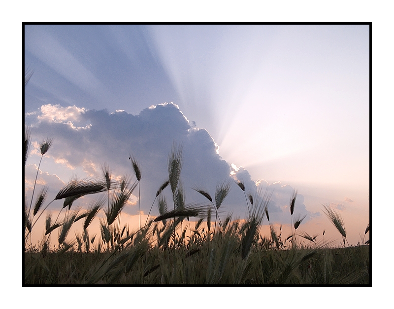 molto bella,...i fasci angelici di luce bilanciati ottimamente dalla nuvola,..e il grano che sta a guardare cullato dal vento del tramonto,...