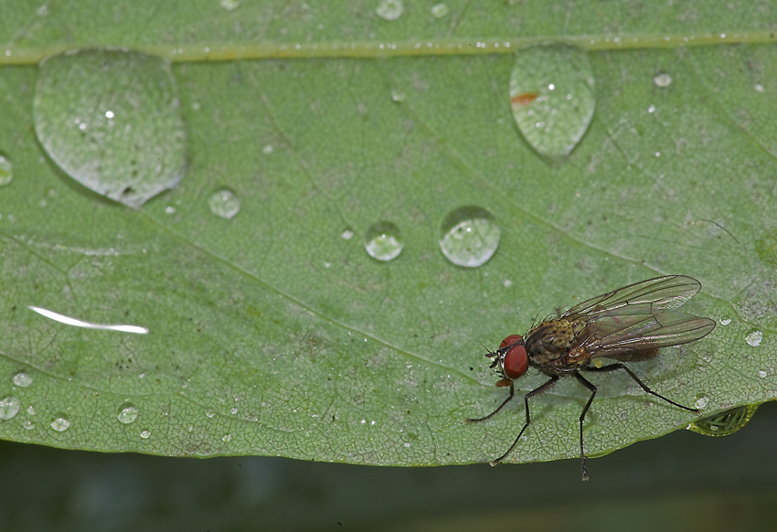 Grazie Cesco, di questi tempi l'alzo preventivo dello specchio è obbligatorio. Scattata a f/20, 1 secondo di esposizione. Notare che nonostante il diaframma piuttosto chiuso dato l'elevato RR e l'inclinazione della foglia, ho avuto a fuoco solo la fascia della mosca. Ok!