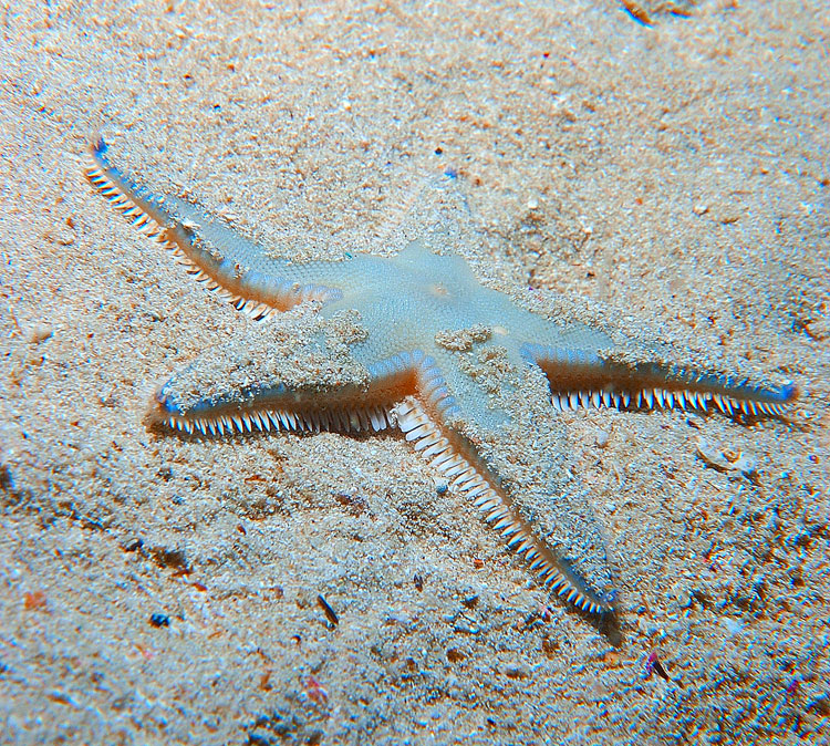 Trattasi di Astropecten bispinonus ma la livrea della parte dorsale dovrebbe essere verde oliva o marrone. Vive fino a 50 mt di profondità e si riproduce da maggio a settembre. E' una specie abbastanza comune.