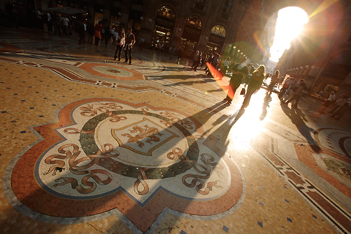 Le ombre lunghe, anzi lunghissime, dei due passanti, il taglio inclinato, la focale scelta e la volontà (forse) di cercare di sfruttare un difetto della lente come un elemento in grado di aggiungere qualcosa allo scatto piuttosto che penalizzarlo. Questi a mio avviso i mezzi utilizzati per cercare di differenziare lo scatto dai tanti analoghi che trattano lo stesso argomento (la passeggiata nella galleria).