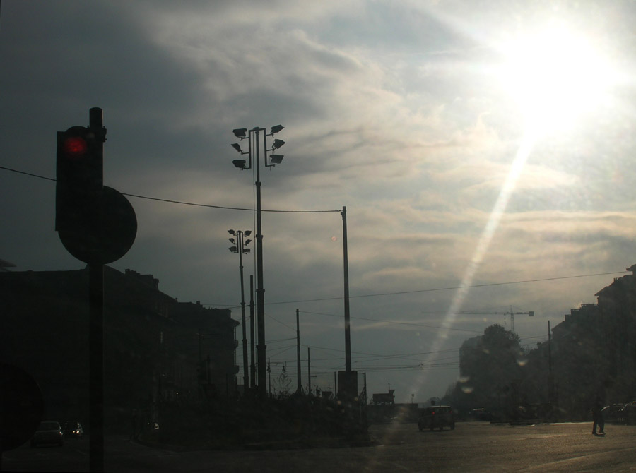 E' storta (ma questo lo avrai visto anche tu, quando hai cercato la verticalità del semaforo). Sembra scattata attraverso il finestrino di un'auto. Le forme non sono silhouette e non sono leggibili, la bruciatura del sole è troppo forte.