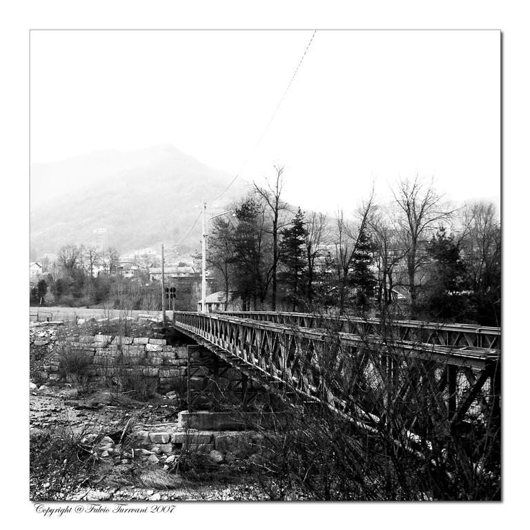 il cielo cosi "bianco" distrae troppo l'attenzione, hai voluto accentuare l'effetto della nebbia, ma si capisce poco, inoltre quelle "tracce" di cavi distrubano ulteriromente, il resto dell'immagine non è malvagio, ma manca cmq di un centro di attenzione, troppi elementi di disturbo, il ponte dovrebbe condurre da qualche parte, ma non si capisce bene dove, la casetta è troppo piccola e nascosta ...