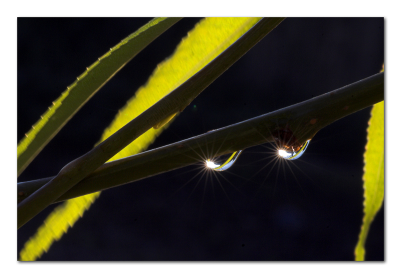 Il mio problema è che comincio a guardare l'inquadratura a f/2.8, e qui le foglioline attorno diventavano splendide pennellate di luce.. ma in fondo l'ispirazione è nata dal bagliore delle gocce e ho cercato di lavorare su quello!!!