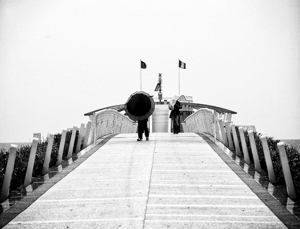 mmm non mi convince molto. Interessante la situazione, ma avrei aspettato che i due fossero più vicini a te in modo da avere gli ombrelli sul chiaro della passerella...
