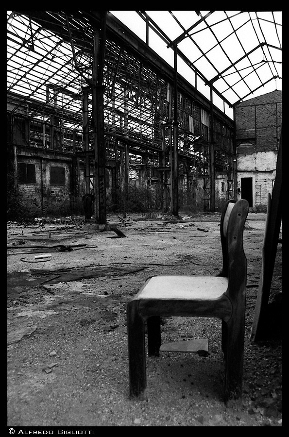 Certamente c'è lo stato di abbandono ma la sedia in primo piano mi fa pensare ad una attesa come se quei ruderi potessero tornare in vita solo per il fatto che qualcuno. che magari ha lavorato lì. vi si sieda, così nei suoi ricordi tutto riprende vita.