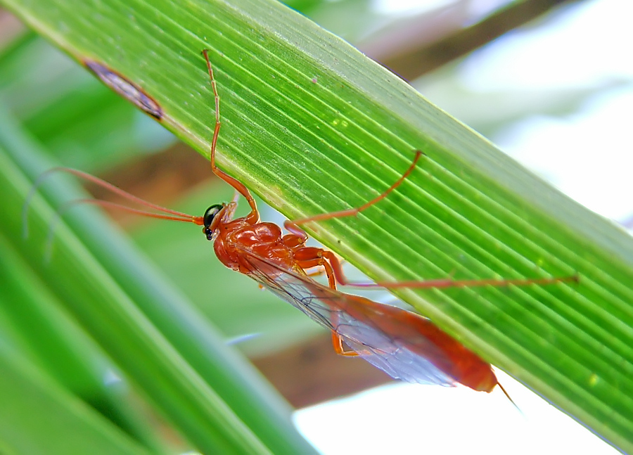 è un HIMENOPTERA SP. non conosco la specie è una femmina, "pungiglione" dietro serve solamente per dipositare le uova sotto pelle di un bruco, in gergo gli chiamano "fantino" le uova si sviluppano in larve dentro un bruco e lo divorano da dentro mentre crescono. è un insetto molto utile per combattere numerosi bruchi che dannegiano agri e floricultura. diversi specie misuranno da 3mm a 5 cm in eropa.