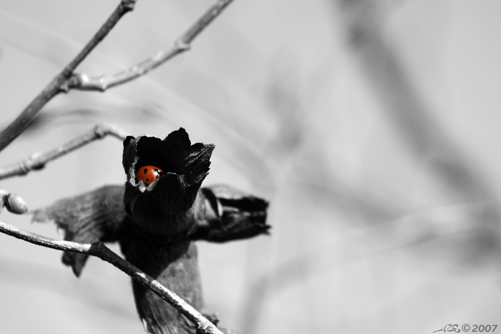 Devo dire che la foto non è abbastanza ricercata, cioè stavo fotografando delle api sui fiori di nocciola (quelle robe lunghe la, non so come si chiamano) e ho visto sto punto arancio che sbucava dal buio...