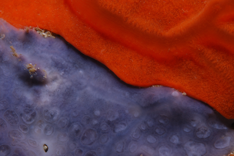 Dettaglio di due specie di spugne che cercano di ricoprirsi a vicenda