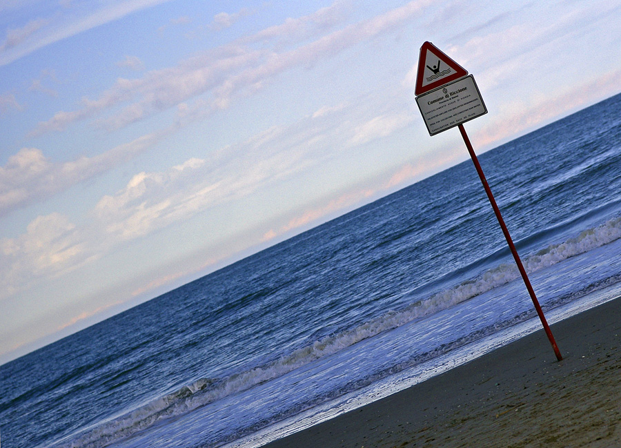 Non parliamo allora di regole ma di linguaggio. Le diagonali tasmettono movimento, le orizzontali calma piatta. Piazzate (o immaginate) un uomo (o una donna, meglio) in acqua con le braccia alzate come nel cartello e pensate quanto cambierebbe la fotografia. In quel modo anche l'inclinazione avrebbe un senso, renderebbe dinamica l'immagine.