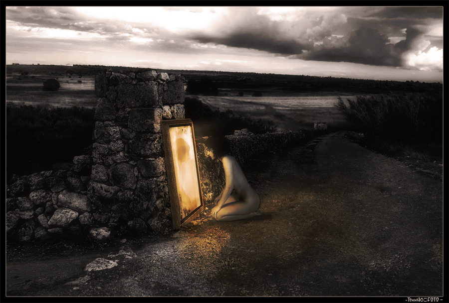 Mi pare di capire che tu abbia fotografato la donna di fronte ad un camino, e un paesaggio esterno, per poi desaturizzare tutto (tranne la luce del camino) e sovrapporre le due immagini...