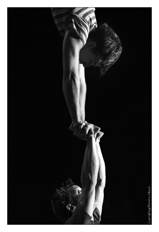 Magnifico lo sguardo tra i due acrobati, i loro visi; la luce disegna i muscoli in tensione con effetto di bellissima simmetria e continuazione.