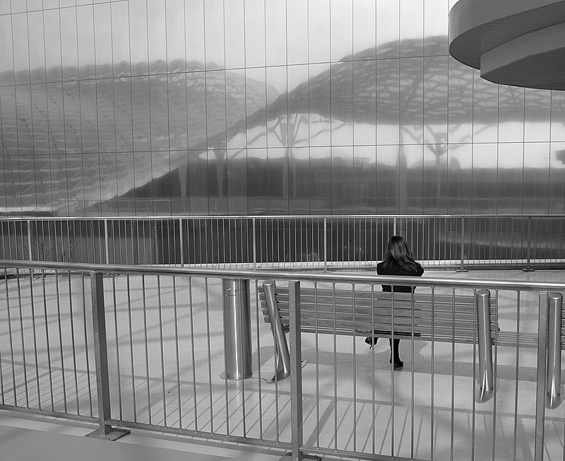 Un gran bel gioco di linee, curve e riflessi e forse uno dei rari casi in cui una composizione ricercata riesce a dare contenuto ad una situazione banale (donna seduta sulla panchina).