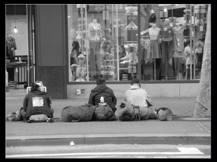 Bella! Mi piace il forte contrasto tra le persone sedute di spalle con i loro cani e la vetrina stile anni '60.