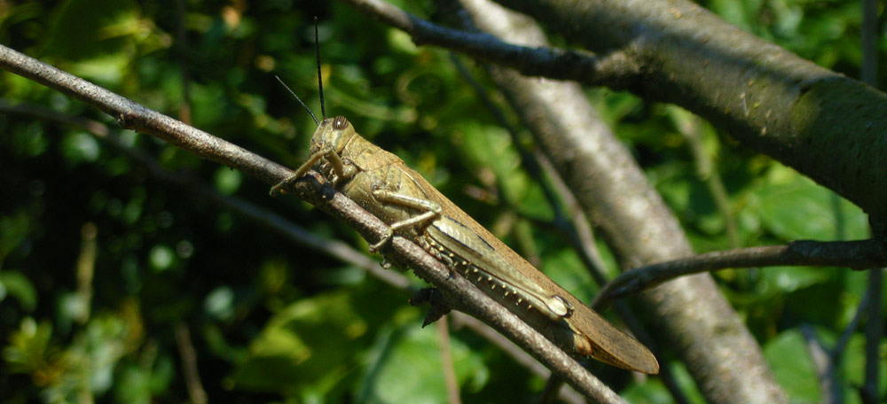 Una simpatica cavalletta si gode il caldo sole primaverile su un albicocco.