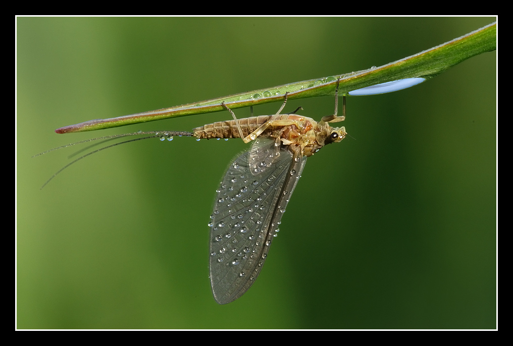 Fantastica! Dal rametto verde con la sua diagonale appena accennata che pare quasi curvarsi al peso delle gocce d'acqua e dell'effimera, per passare all'insetto tutto ricoperto di rugiada... le goccioline sembrano tanti occhi che ti guardano.  |