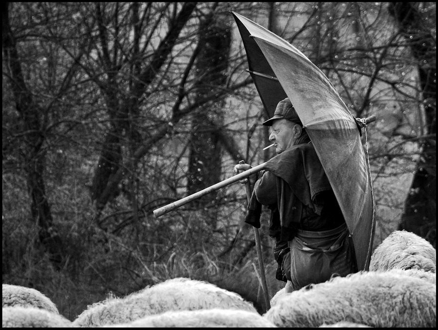 mi piace il punto di ripresa del pastore, avrei incluso meglio anche qualche pecorella...strano l'effetto delle goccioline, sembra una foto eseguita sott'acqua