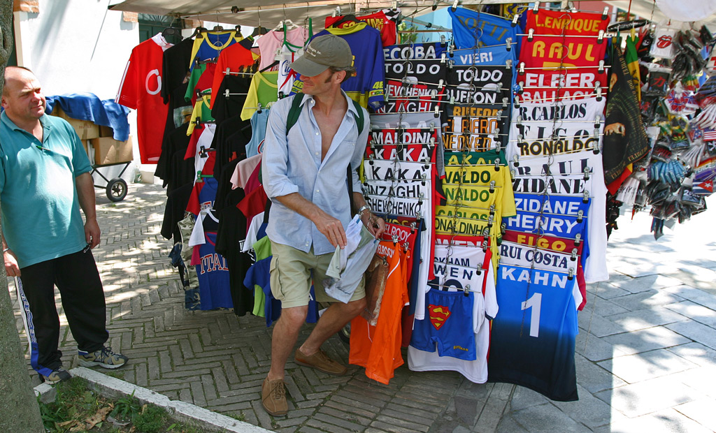 La composizione, in senso assoluto, è sbilanciata a sinistra (proverei a tagliare un po' a destra subito dopo le t-shirt in primo piano), ma l'eloquenza della scena, resa possibile grazie alla rapidità nello scattare al momento giusto, compensa tale imperfezione, nell'economia generale della foto. Il colore, per quanto massicciamente presente, non distrae dalla scena principale che resta facilmente intellegibile.
