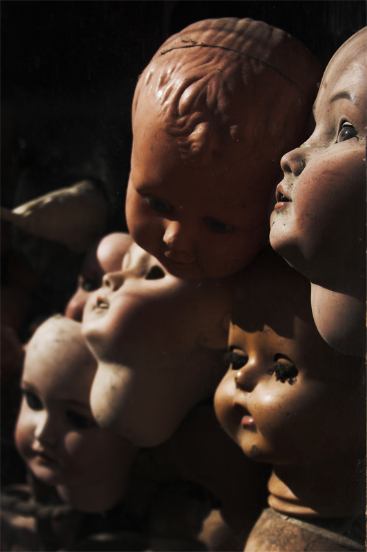 Tutte le bambole hanno il viso rivolto lontano, tutte nella stessa direzione ...tranne una. Tutte hanno lo sguardo vitreo e assente, tutte ....tranne una ed è proprio quella che sembra aver appena reclinato la testa come destata e incuriosita da un improvviso rumore.