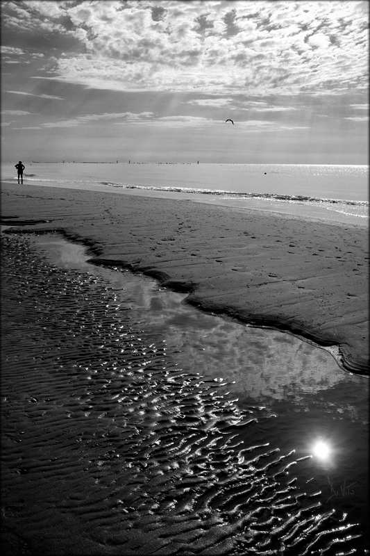 Luce, taglio, prospettiva, B/N, grafismo, presenza umana, mare, cielo, raggi solari... tutto è perfetto. E quel sole specchiato, luminossisimo, messo lì quasi a controbilanciare il nero dell'omino all'orizzonte...