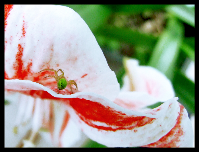 La cosa che mi interessava era il colore del ragno che da una parte contrastava col rosso del fiore e dall'altra riprendeva perfettamente il verde del fogliame.