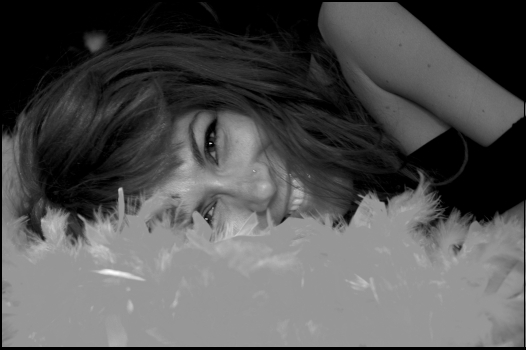 beeeelllaaaa... la composizione mi piace tantissimo, solo che io ci trovo un sacco di cose che mi non piacciono molto.. il bn del viso è buono, ma poco contrastato... anke le piume, non essendo bianche non hanno un bell'impatto visivo... poi c'è il braccio... suppongo che il vestito avesse una manica con un ampio spacco, ke in questo caso però si confonde con lo sfondo e poi è un po' pikkolina...