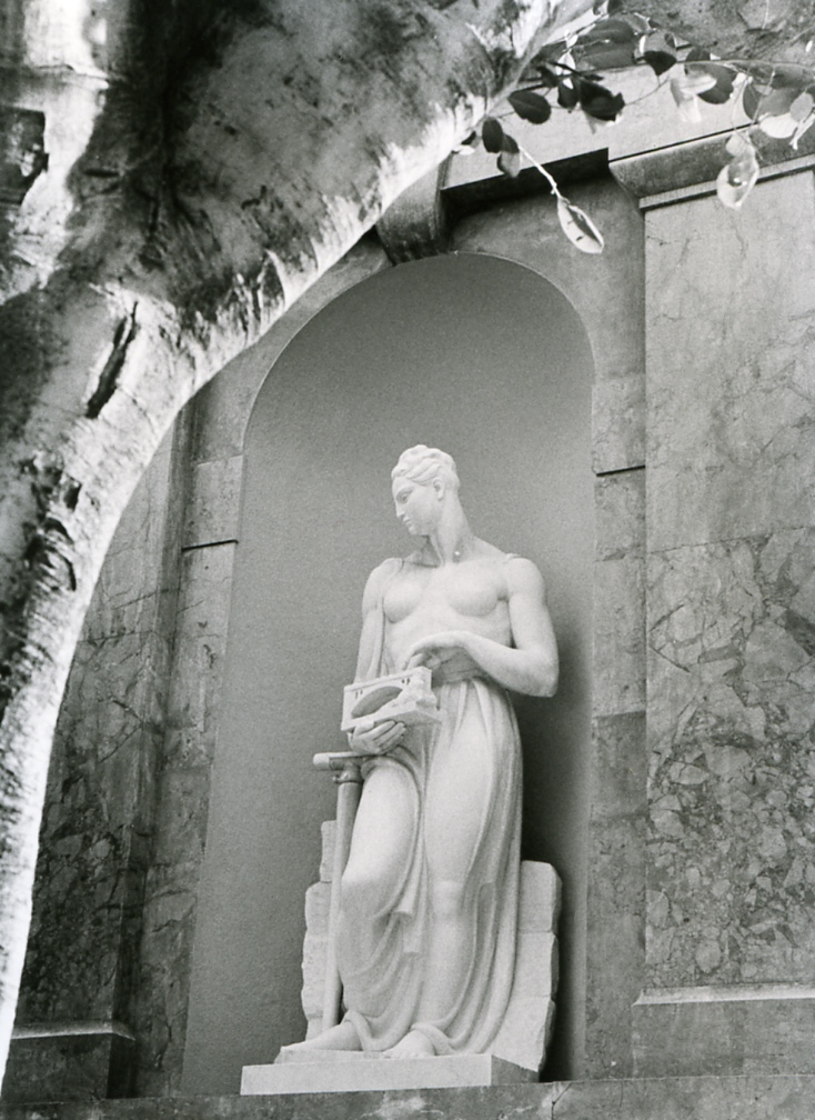 Mi piace, ma forse avrei cercato di incastrare un po' di più la statua tra l'albero e la sua nicchia. Un po' più a fuoco il tronco come lo vedresti?