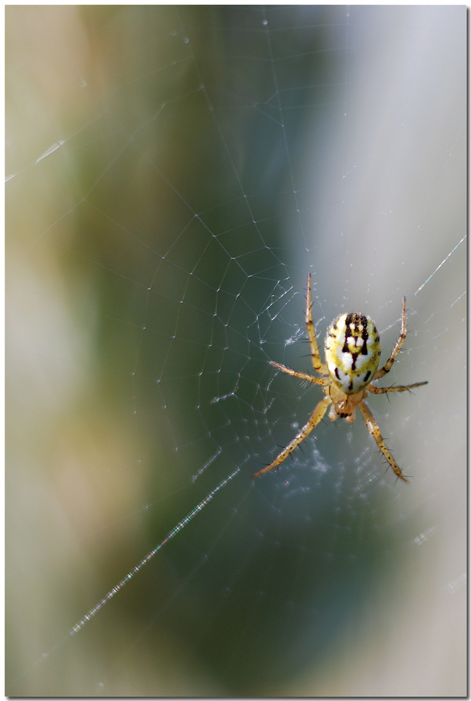 Bellissimo lo sfondo e la nitidezza sul soggetto... se proprio vogliamo essere puntigliosi il filo della tela in basso a sinistra mosso o comunque non a fuoco da fastidio con il suo riflesso, ma comunque resta un grande scatto.