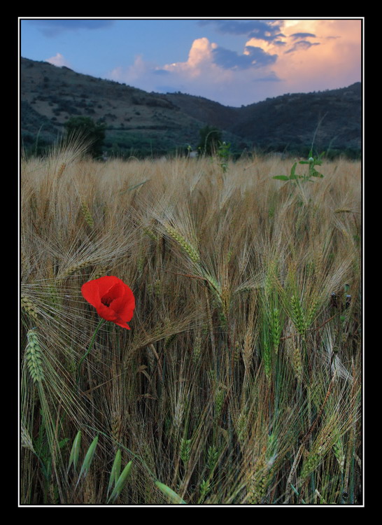 ho fatto molti scatti in quel campo di grano..ma alla fine mi ha colpito la segreta corrispondenza tra il magnifico rosso del papavero e il rosato del cielo...e allora ho chiuso il diaframma il più possibile..e ho scattato...