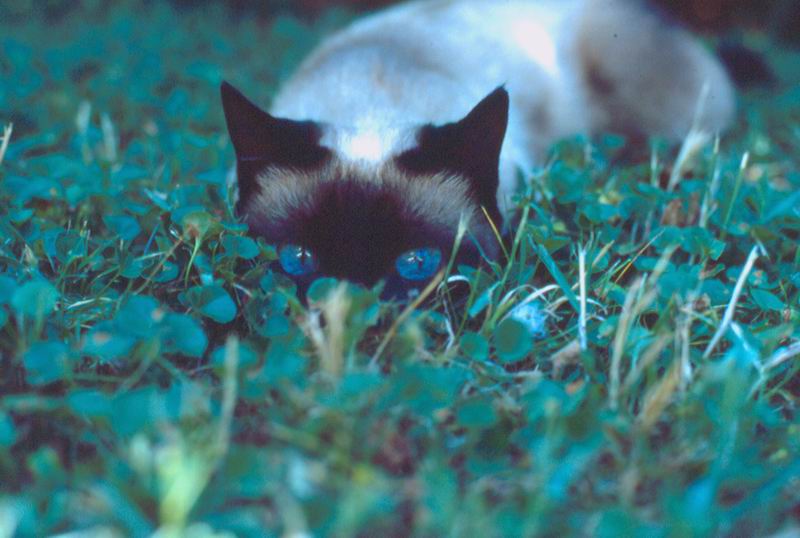 nell'originale predomina il verde del prato e gli occhioni blu del gatto.