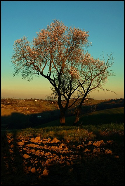 ecco topo cosa mi ha colpito in primis! che l'alberello nella cromia riprendeva le zolle illuminate dall'ultima luce del giorno!
