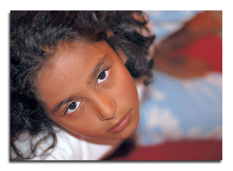 una bella immagine , non costruita e tutta giocata sul contrasto tra l'abbozzato sorriso delle labbra e la pensierosa malinconia degli occhioni scuri